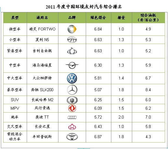 2011年度中国环境友好汽车排行榜