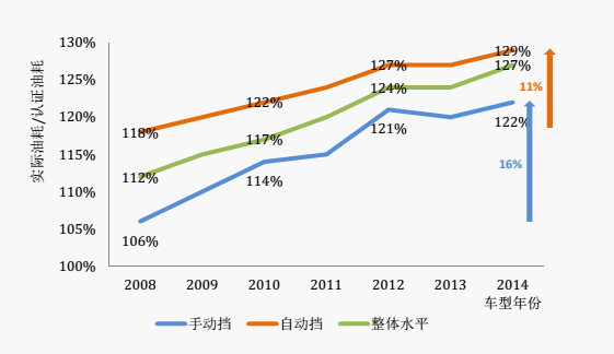 2008-2014年份车型实际油耗与工况油耗差异