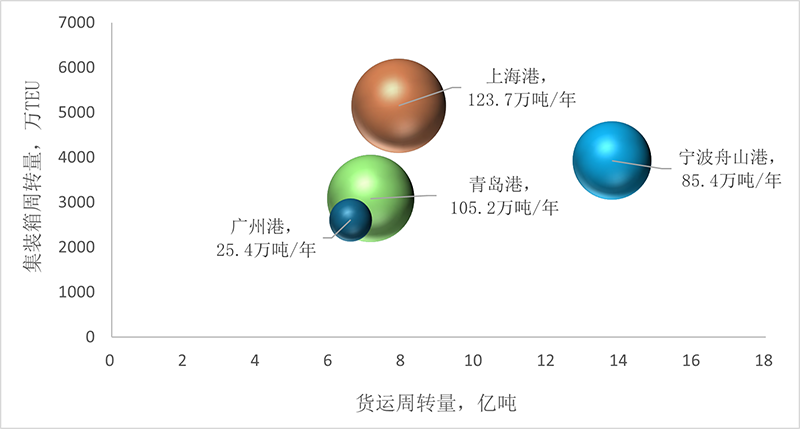 注:图中气泡对应的横坐标为港口2024年的货运周转量(亿吨),纵坐标为港口2024年的集装箱周转量(万TEU),气泡大小表示港口在2024年的碳排放水平。